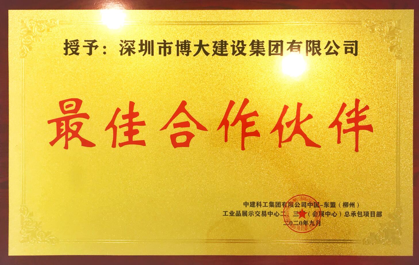 在中國—東盟(柳州)工業品展示交易中心項目建設中,博大人矢志不渝地踐行“讓顧客有幸福感”的企業魂,牢記“將履約視為生命”的莊嚴承諾,不講條件、全力以赴,最終以過硬的工程質量、切實的工期保障、卓越的履約能力得到甲方的高度認可,榮獲中建科工集團有限公司頒發的“最佳合作伙伴”!
